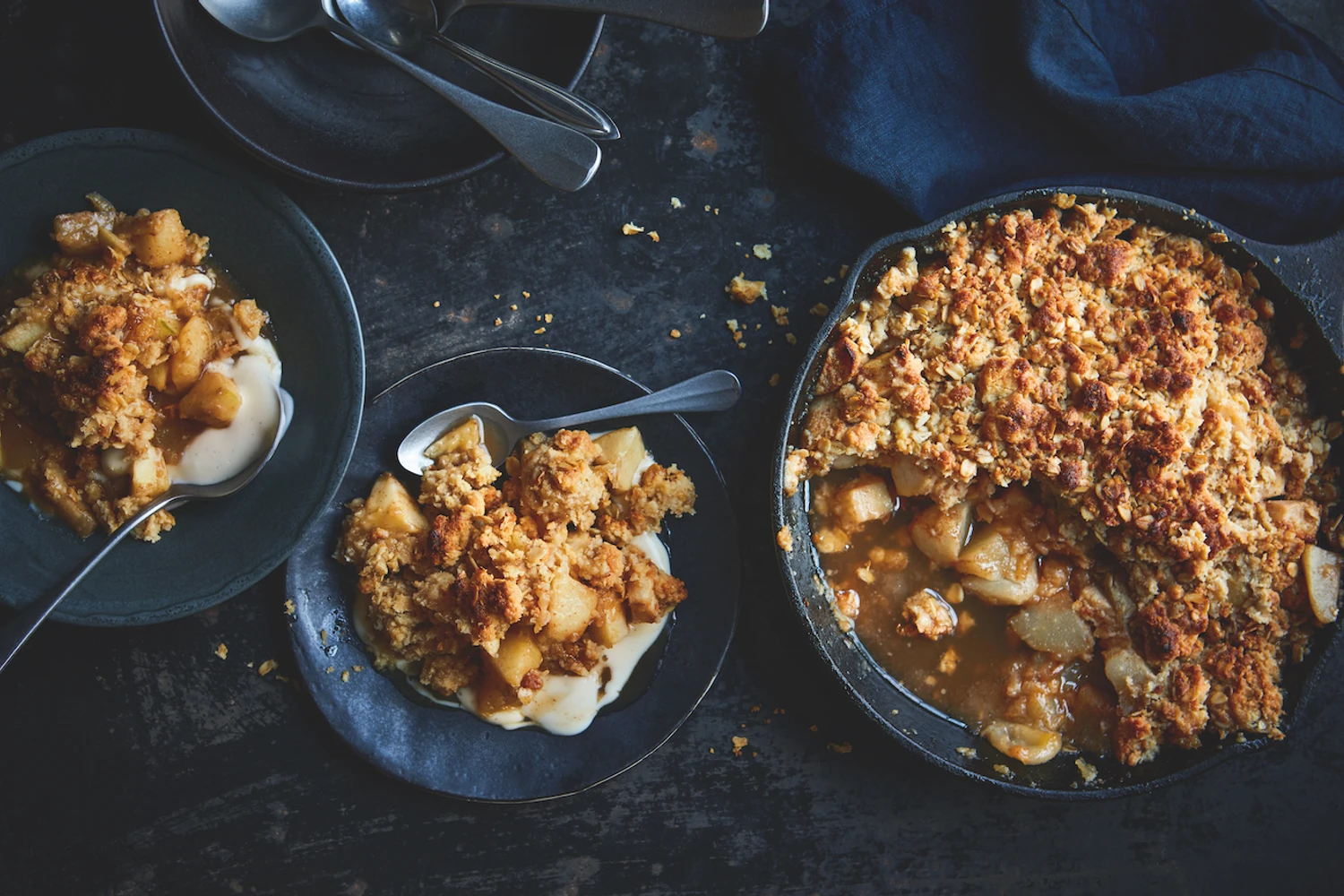 Spoon the crumble topping over the fruit and bake for 30–40 minutes, until golden brown. Serve with a splash of cream or custard, if you like.